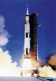 Viaje de ida. El 16 de Julio de 1969, a las 15 horas y 32 minutos, se lanzó la misión Apolo 11, cuyo destino era posarse por primera vez en la superficie de la Luna. Como estaba previsto, se utilizó el Saturno V, un gigantesco cohete de más de 100 metros de altura, siete veces más potente que el de Gagarin, con la nave Apolo como carga útil y con los astronautas Neil A. Armstrong, comandante de la misión; Michael Collins, piloto del Módulo de Mando y Edwin E.(Buzz) Aldrin Jr., piloto del Módulo Lunar. (Los vemos de izquierda a derecha en la foto)